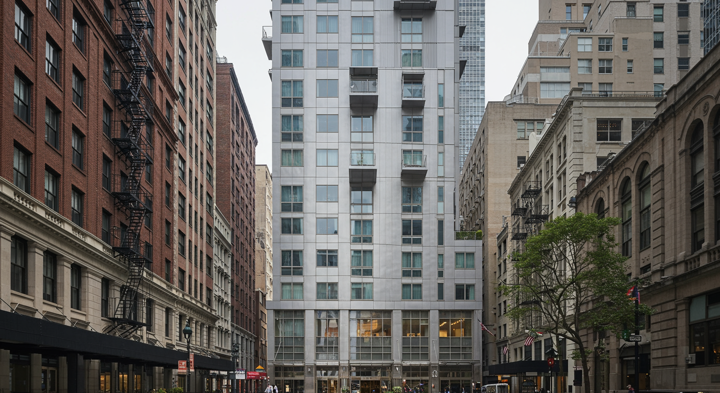 The drama begins above the sixth floor, when what looks like a different building seems to arc upward for an additional 13 stories. This part of the façade is regimented, with a sequence of steel-clad cantilevered balconies against an equally pale metal cladding.